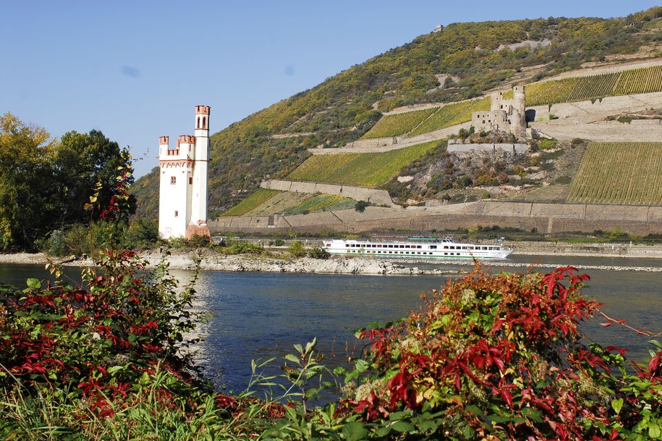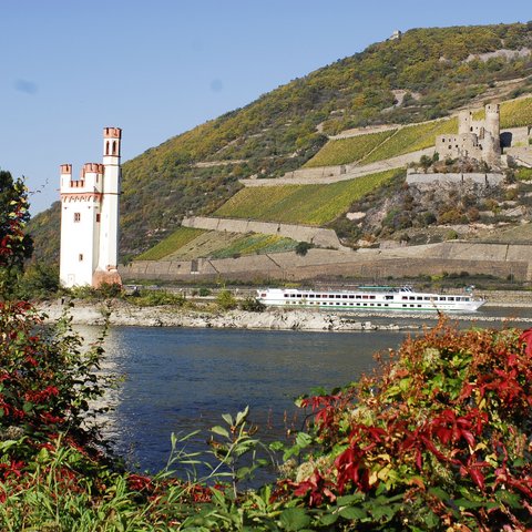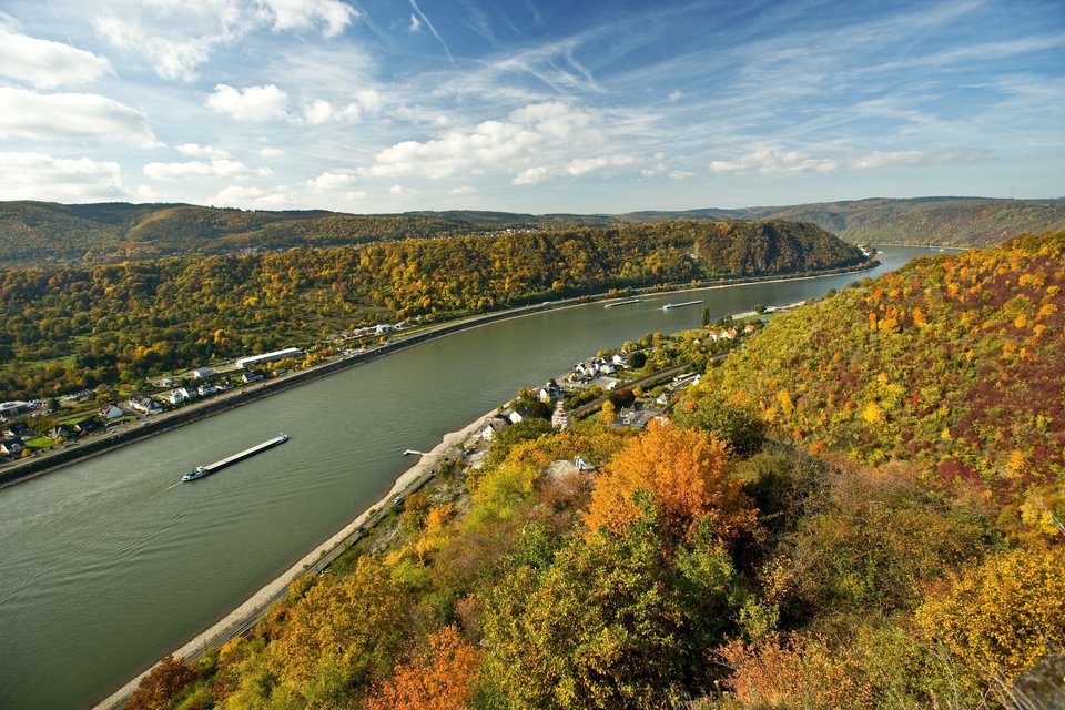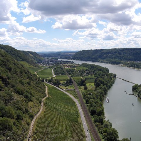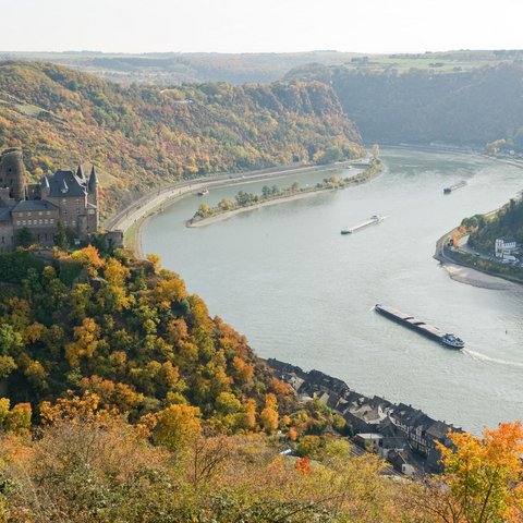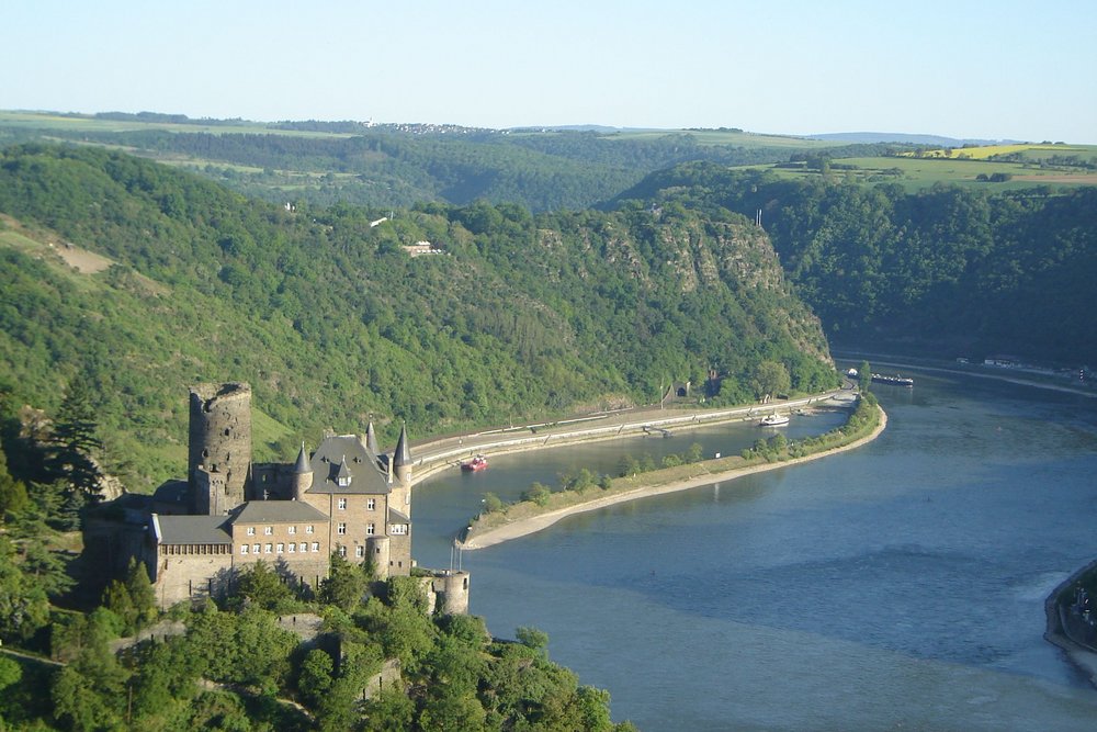 Kaum ein Artikel über den Rhein, ohne ein Foto des berühmten Loreleyfelsen. Burg Katz und Loreley kannst Du am besten auf Etappe 15 nach einem steilen Aufstieg von St. Goarshausen aus erleben.Burg Katz hieß übrigens offiziell Burg Neukatzenelnbogen, benannt nach den Bauherren, den Grafen von Katzenelnbogen. Doch schnell machte sich der Spitzname breit. Die benachbarte, konkurrierende Burg Thurnberg, wurde alsbald im Volksmund in „Burg Maus“ umgetauft.